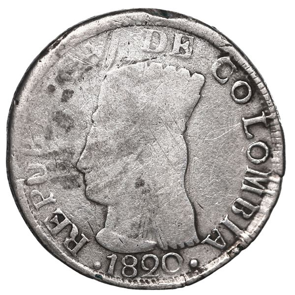 Bogota, Colombia (Cundinamarca), 2 reales, 1820 J.F, mintmark BA, dots in both legends, rare. Restrepo-unl (155.1); KM-C5. 4.24 grams. Partially crude
