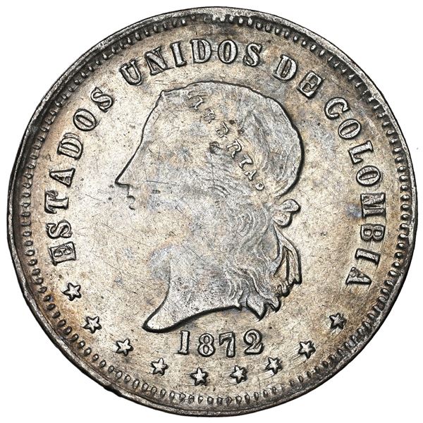 Medellin, Colombia, 5 decimos, 1872, NGC AU 53 ("top pop"). Restrepo-296.1; KM-153.3. Lightly rainbow toned over luster, the obverse with...