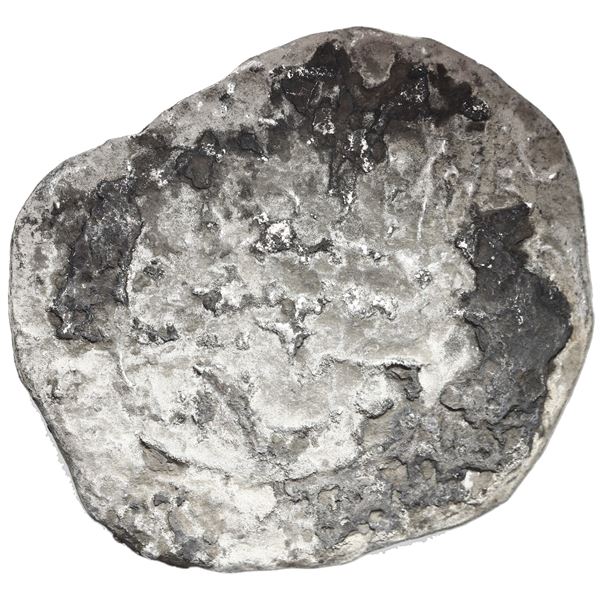 Potosi, Bolivia, cob 8 reales, Philip III, assayer not visible, Grade 4. KM-10. 6.50 grams. Corroded and thin along the edges, some bold shield detail