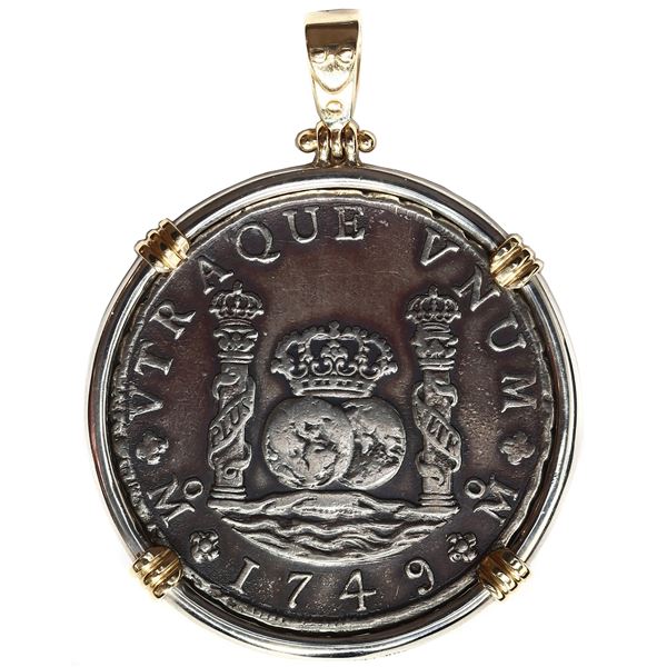 Mexico City, Mexico, pillar 8 reales, Ferdinand VI, 1749 MF, mounted pillars-side out in silver bezel with 14K gold prongs and shackle bail. 38.23 gr