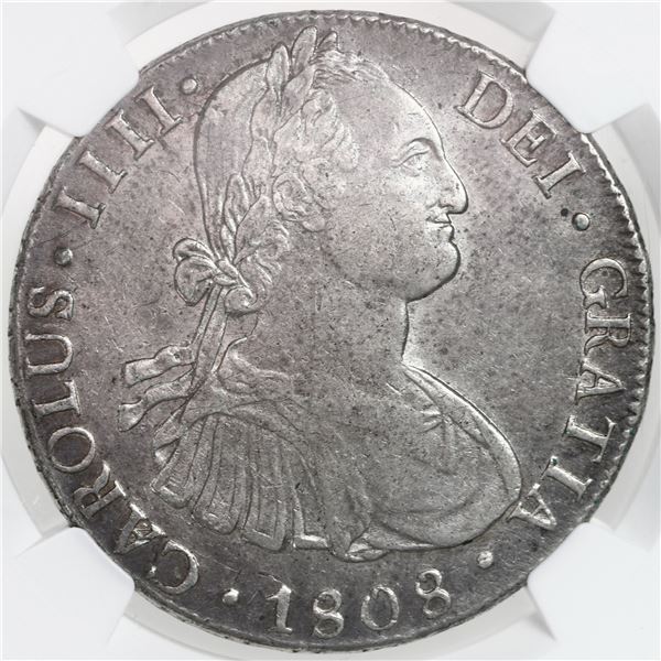 Potosi, Bolivia, bust 8 reales, Charles IV, 1808 PJ, NGC AU 53. KM-73; Cal-732. Lustrous example with high points a bit flat from strike weakness rat