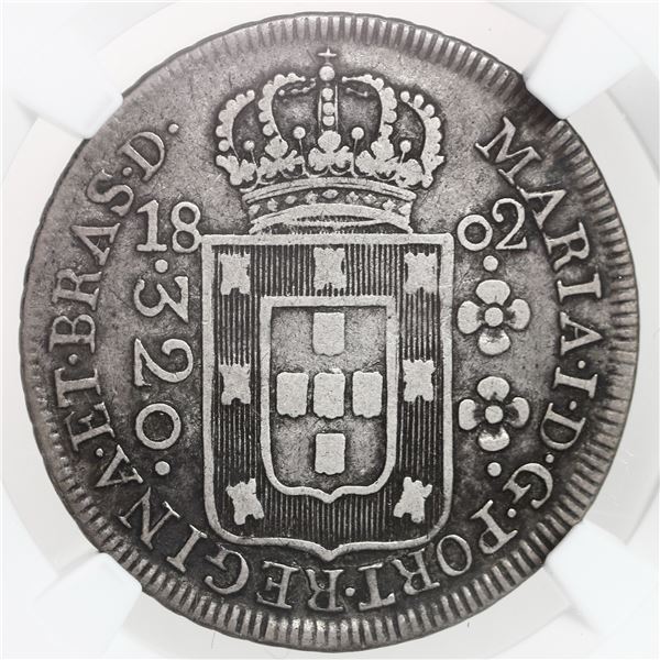 Brazil (Rio mint), 320 reis, 1802-R, Maria I, NGC VF 35. Russo-377; Gomes-19.02; KM-221.3. Light golden-toned, circulated surfaces.