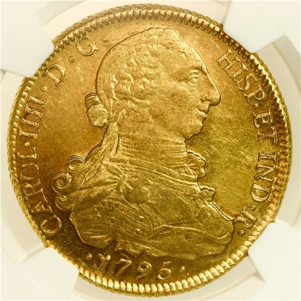 Santiago, Chile, gold bust 8 escudos, Charles IV (bust of Charles III), 1795 DA, NGC MS 62. KM-54; Cal-1760; Fr-23. Handsome piece with a prooflike q