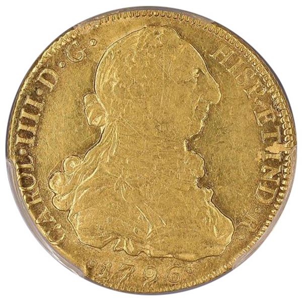 Santiago, Chile, gold bust 8 escudos, Charles IV (bust of Charles III), 1796 DA, PCGS AU55. KM-54; Cal-1761; Fr-23. Bright, golden surfaces with ligh