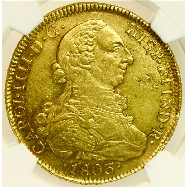 Santiago, Chile, gold bust 8 escudos, Charles IV (bust of Charles III), 1803 FJ/JJ, NGC AU 55. KM-54; Cal-1773; Fr-23. Bold strike with minor circula