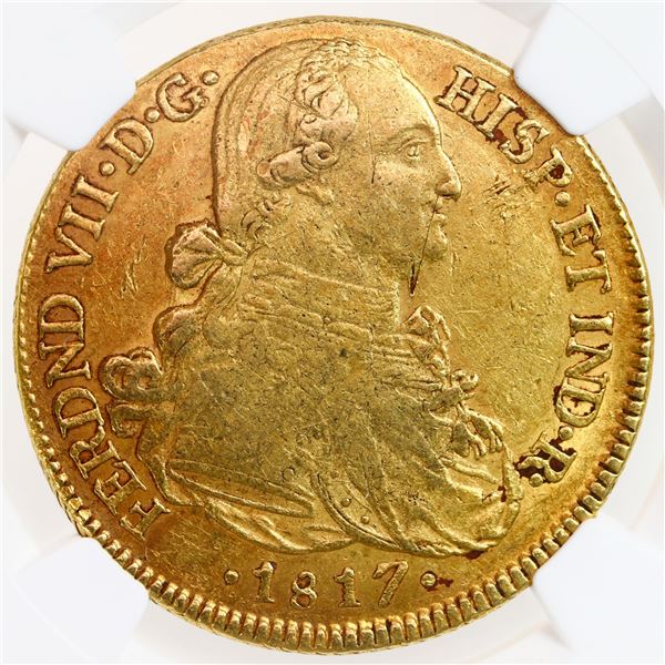 1538 - Bogota, Colombia, gold bust 8 escudos, Ferdinand VII (bust of Charles IV), 1817 JF, NGC AU 53.Sedwick & Associates, LLC