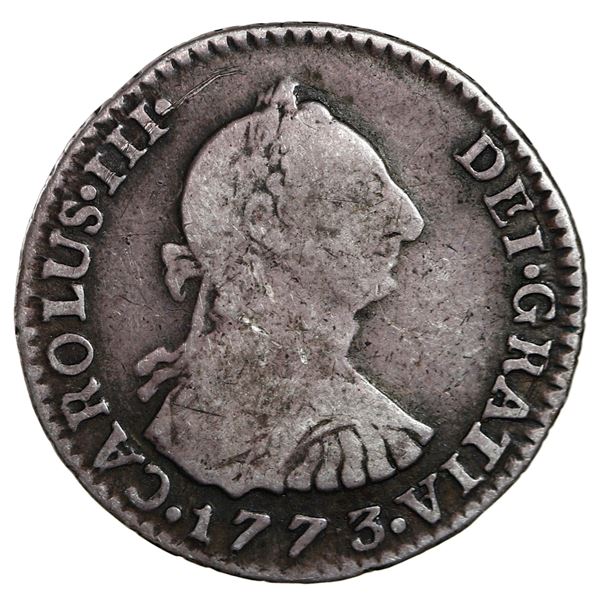 Bogota, Colombia, bust 1 real, Charles III, 1773 V.J. Restrepo-38.3; Cal-501; KM-46.1. 3.45 grams. Fine with circulation cameo contrast, minor scratch