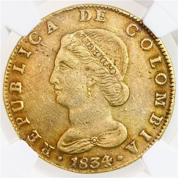 1544 - Bogota, Colombia, gold 8 escudos, 1834 RS, NGC XF details / cleaned.Sedwick & Associates, LLC