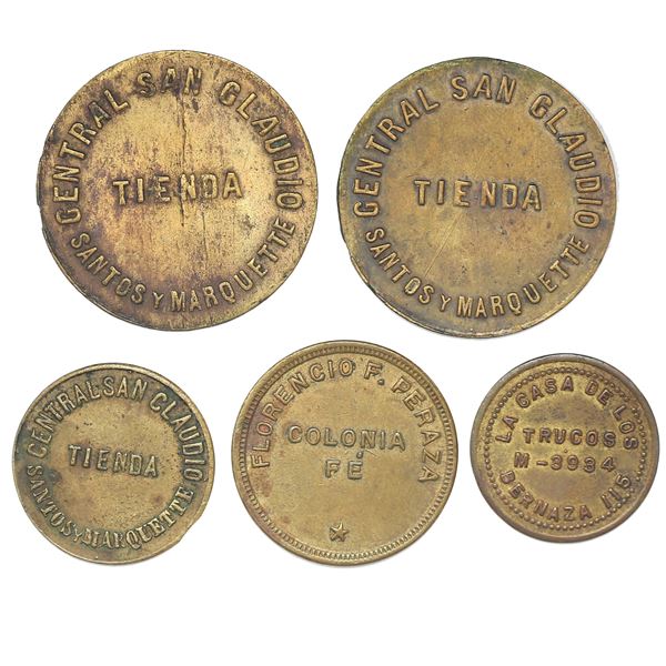 Lot of six bronze Cuban tokens. 25.35 grams total. Several scarce types in this group including a nice Central San Claudio issue, generally VF to AU.