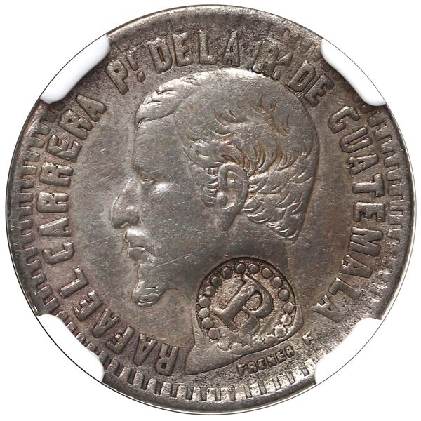 El Salvador, 1 real, R-in-beaded-circle countermark (Type IV, 1862-3) on a Guatemala 1 real, 1860R, NGC VF 20, c/s XF standard. KM-89. Bold, nearly c