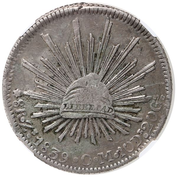 1590 - Zacatecas, Mexico, cap-and-rays 8 reales, 1839 OM, NGC AU 55.Sedwick & Associates, LLC