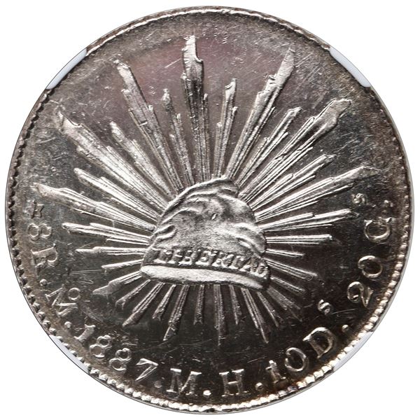 Mexico City, Mexico, cap-and-rays 8 reales, 1887 MH, NGC MS 62. KM-377.10; DP-Mo72. Bright, prooflike surfaces with sharply struck details, a few sca