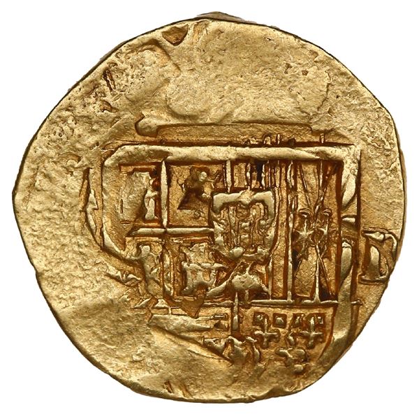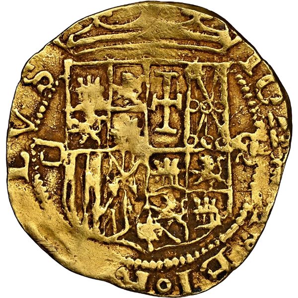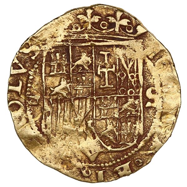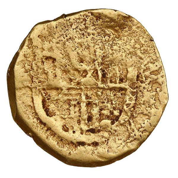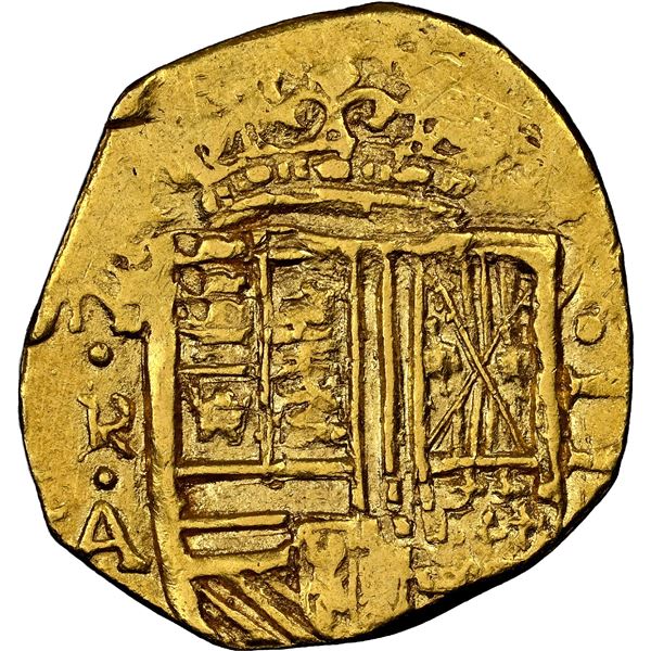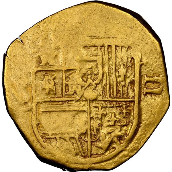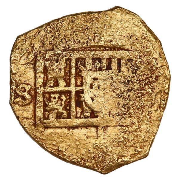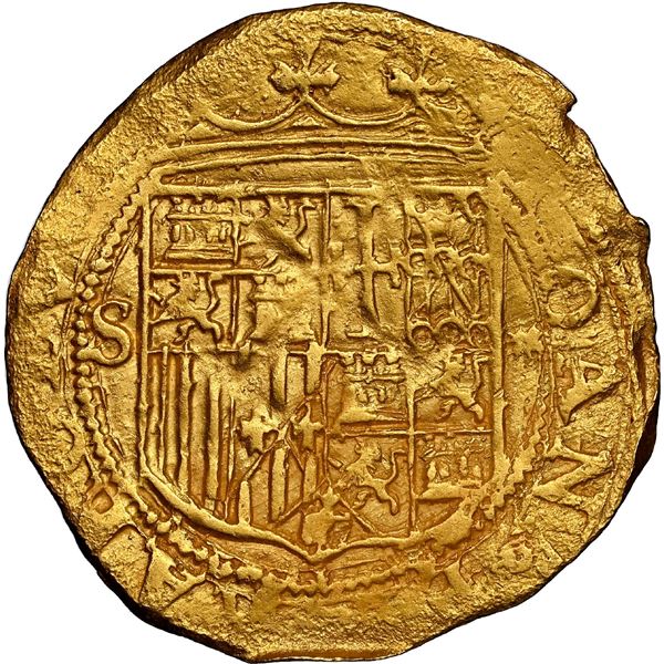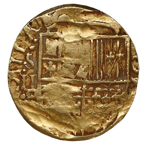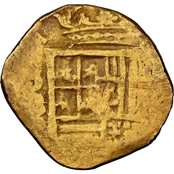 Seville, Spain, gold cob 2 escudos, Philip III, assayer not visible, flipover double-strike (rare). Cal-Type 196; KM-20; Fr-189. 5.36 grams. Rare exam