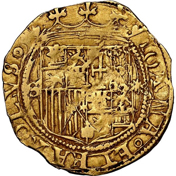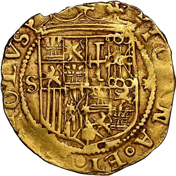 Seville, Spain, gold 1 escudo, Charles-Joanna, assayer Gothic D to left, mintmark S to right. Cal-199; Fr-153. 3.28 grams. VF with some scratches, nea