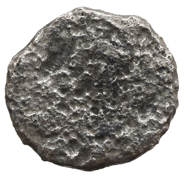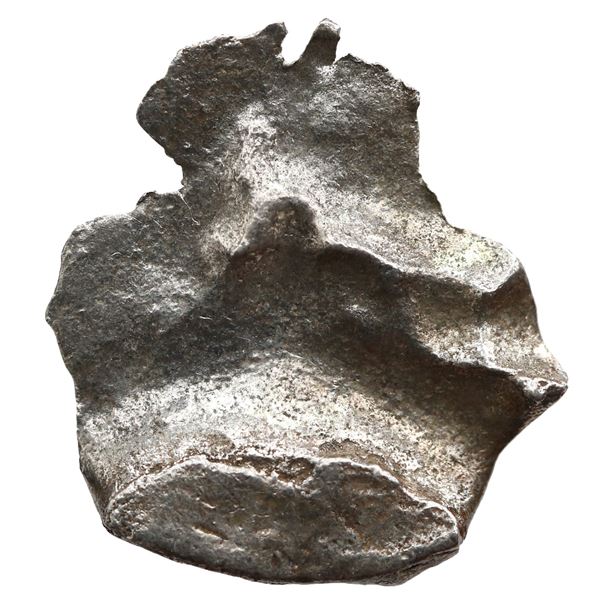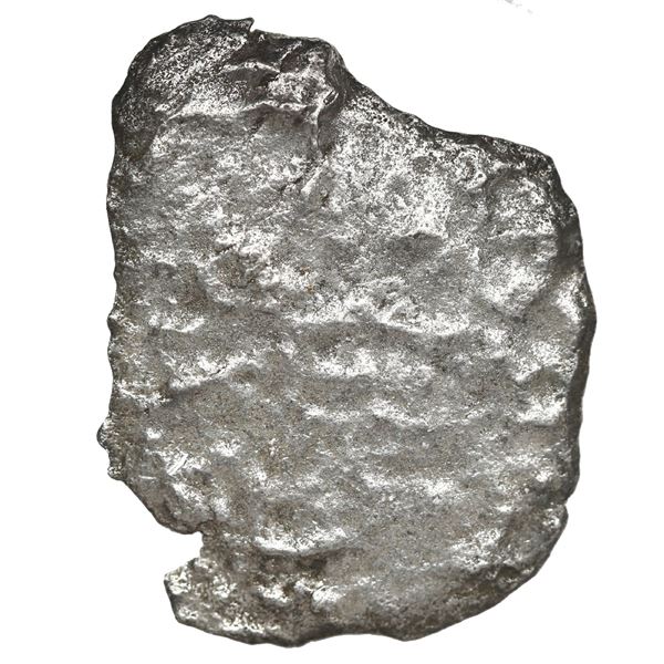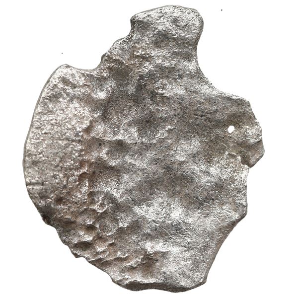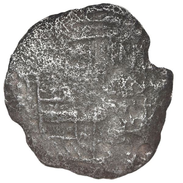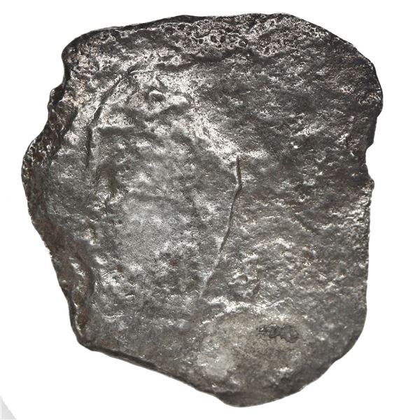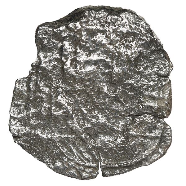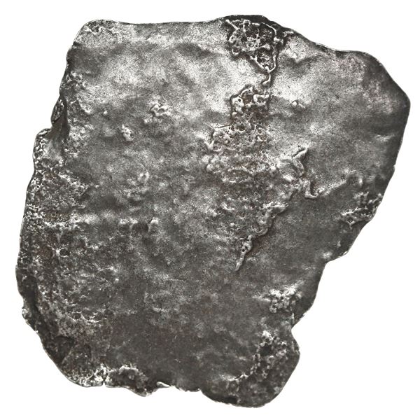 Potosi, Bolivia, cob 2 reales (fragment), Philip III, assayer not visible. KM-8. 2.97 grams. Small, round piece with no discernible design details. Wi