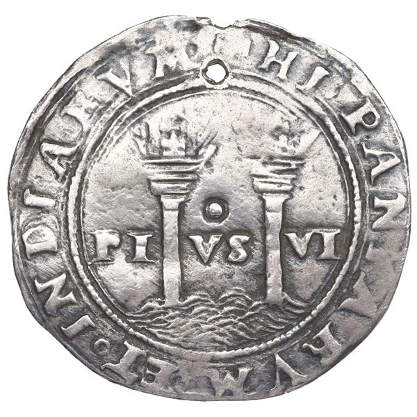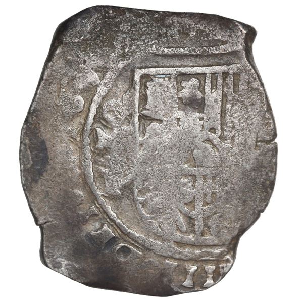 Mexico City, Mexico, cob 8 reales, Philip II or III, assayer not visible. 26.82 grams. VF with several edge-cracks, most of shield visible plus full
