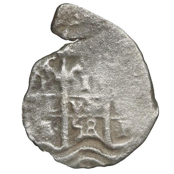Potosi, Bolivia, cob 1 real, 1658 E. S-P37a; KM-13; Cal-760. 1.49 grams. Decent piece with full pillars side date, cross a bit weak and doubled, neat