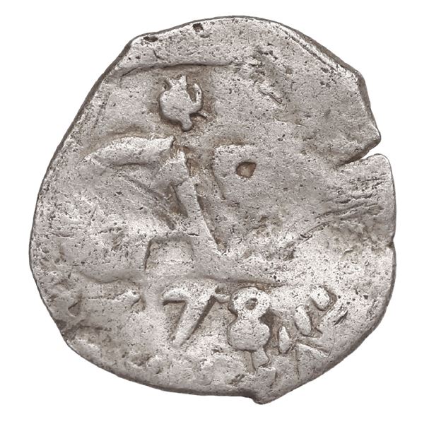Potosi, Bolivia, cob 1/2 real, 1678/7, very rare. S-P37b; KM-unl (22 for type); Cal-unl. 0.99 gram. Desirable as having all three dates visible, two o
