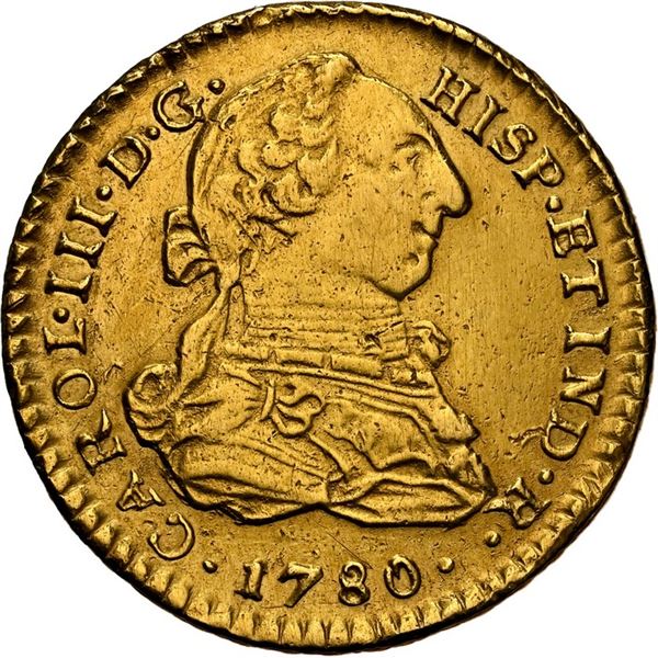 PERU, Lima, gold bust 1 escudo, Charles III, 1780 MI, NGC AU details / removed from jewelry, ex-Almenara. Cal-1346; Fr-35; KM-79. Bold details with br