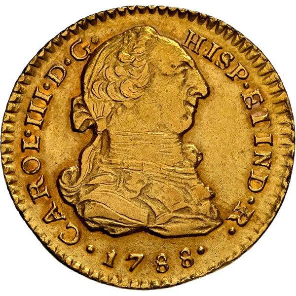 PERU, Lima, gold bust 1 escudo, Charles III, 1788 IJ, ex-Almenara. Cal-1355; Fr-35; KM-79A. AU with choice luster and nearly full rims, the bust a bit