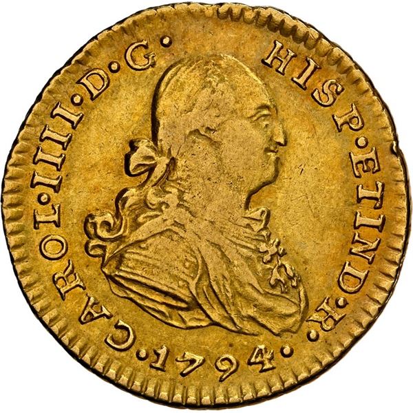 PERU, Lima, gold bust 1 escudo, Charles IV, 1794 IJ, NGC AU 50, ex-Almenara. Cal-1088; Fr-43; KM-89. Rich gold color with luster on fields, slightly w