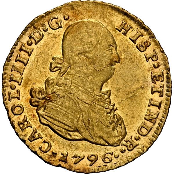 PERU, Lima, gold bust 1 escudo, Charles IV, 1796 IJ, NGC UNC details / rev spot removed, finest and only example in NGC census, ex-Almenara. Cal-1090;
