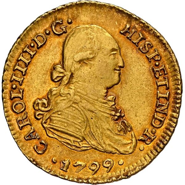 PERU, Lima, gold bust 1 escudo, Charles IV, 1799 IJ, NGC AU 58, finest known in NGC census, ex-Almenara. Cal-1093; Fr-43; KM-89. Rich gold color with