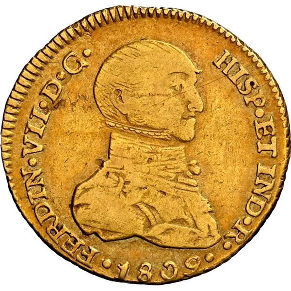 PERU, Lima, gold bust 1 escudo, Ferdinand VII transitional ("imaginary" bust), 1809 JP, extremely rare, NGC VF 25, finest and only example...
