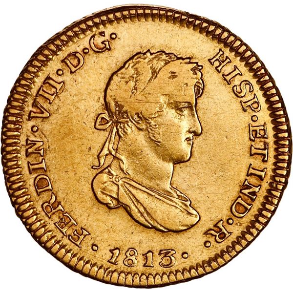 PERU, Lima, gold bust 1 escudo, Ferdinand VII, 1813 JP, small bust, very rare, NGC AU details / cleaned, ex-Almenara. Cal-1500; Fr-53; KM-119. Bold st