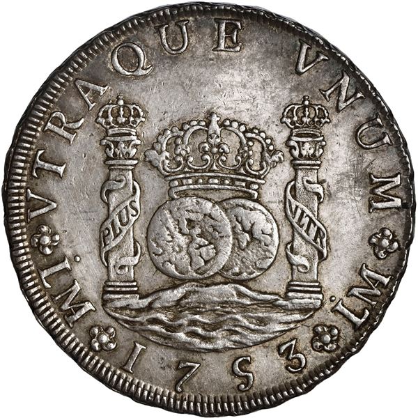PERU, Lima, pillar 8 reales, Ferdinand VI, 1753 J, ex-Brameld. Yonaka-L8.53; Cal-455; KM-55.1. 26.93 grams. Bold AU with lustrous fields (oddly matte