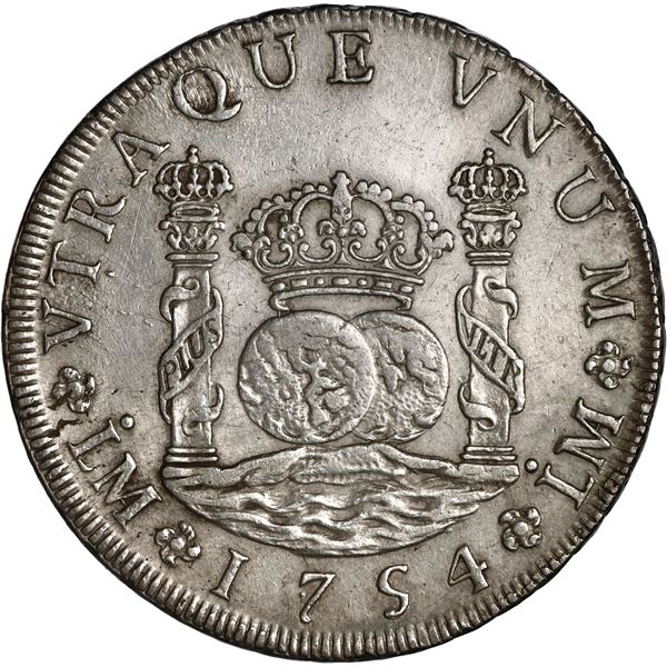 PERU, Lima, pillar 8 reales, Ferdinand VI, 1754 JD, ex-Brameld. Yonaka-L8.54; Cal-457; KM-55.1. 26.76 grams. AU with muted luster, hairlines, bold str