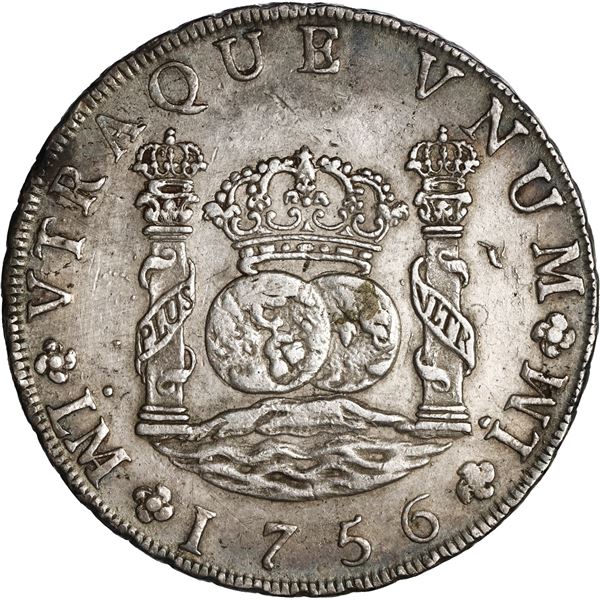 PERU, Lima, pillar 8 reales, Ferdinand VI, 1756 JM, ex-Brameld. Yonaka-L8.56; Cal-462; KM-55.1. 26.76 grams. XF+ with very light rainbow toning over m