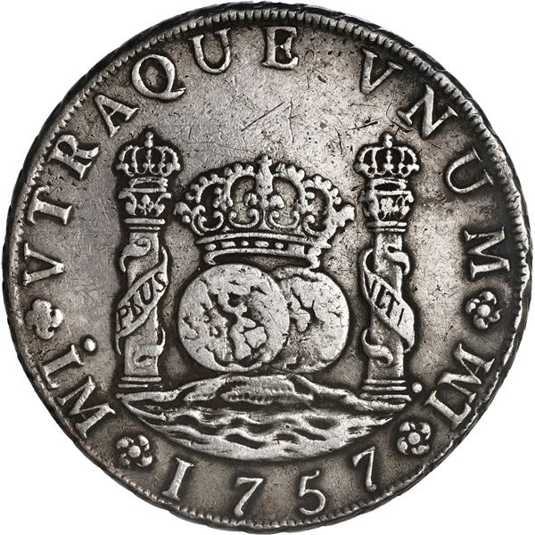 PERU, Lima, pillar 8 reales, Ferdinand VI, 1757 JM, ex-Brameld. Yonaka-L8.57; Cal-464; KM-55.1. 26.77 grams. Bold AXF with choice toning around detail