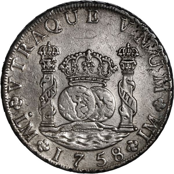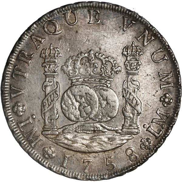 PERU, Lima, pillar 8 reales, Ferdinand VI, 1758 JM, ex-Brameld. Yonaka-L8.58; Cal-466; KM-55.1. 26.96 grams. AU- with decent luster, rainbow toning at