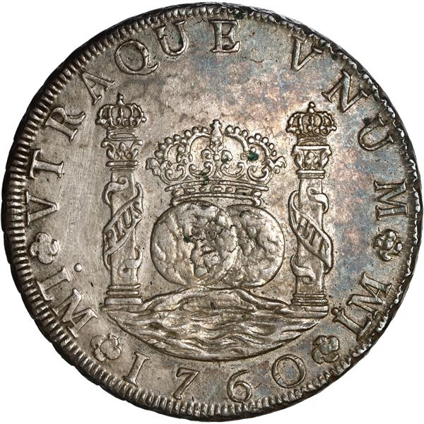 PERU, Lima, pillar 8 reales, Ferdinand VI, 1760 JM, ex-Brameld. Yonaka-L8.60; Cal-468; KM-55.1. 27.09 grams. Bold AU with splashy rainbow toning over