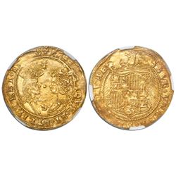 Seville, Spain, double excelente, Ferdinand-Isabel, ermine at top, S between ringlets at bottom between busts, ermine to left of shield, encapsulated