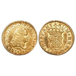 Madrid, Spain, bust 1/2 escudo, Ferdinand VI, 1752JB, ex-Eliasberg. CT-249; KM-378. 1.58 grams. XF+ with lustrous fields due to light cleaning, red to