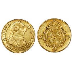 Madrid, Spain, bust 1/2 escudo, Charles III, 1786DV. CT-778; KM-425.1. 1.73 grams. AU with hints of toning and luster, very nice.