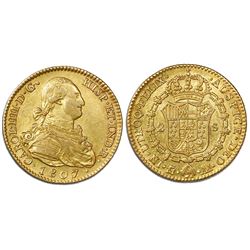 Madrid, Spain, bust 2 escudos, Charles IV, 1797MF. CT-334; KM-435.1. 6.86 grams. Choice XF with nice luster, no problems.