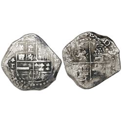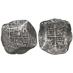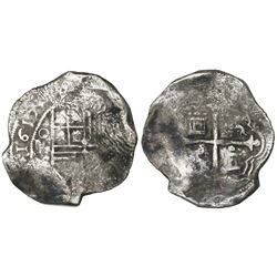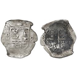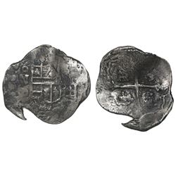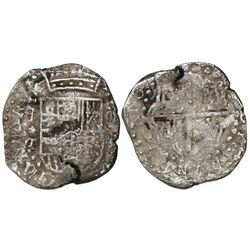 Potosi, Bolivia, cob 8 reales, Philip III, assayer T, mintmark "q" (backwards P), quadrants of cross transposed. S-P22a; KM-19. 23.59 gram...