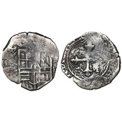 Cartagena, Colombia, cob 8 reales, (16)22A, mintmark RN, pomegranate under escutcheon, very rare, Grade 3. Restrepo-M42.1; S-C2; KM-3.2; CT-251. 22.21