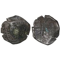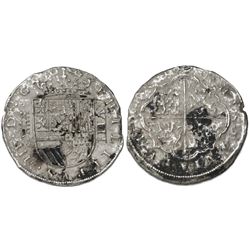 Potosi, Bolivia, cob 2 reales, Philip II, assayer B (3rd period), Grade 1 (Grade-2 quality). S-P10; KM-3.2; CT-509. 5.14 grams. Thin from corrosion bu