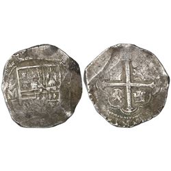 Mexico City, Mexico, cob 8 reales, Philip IV, assayer D (1620s). S-M18a; KM-45. 21.56 grams. Bold oMD and denomination 8, full but weak shield and cro
