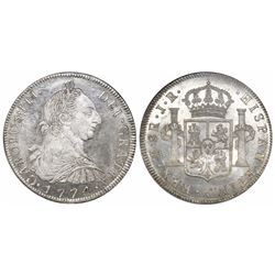 Potosi, Bolivia, bust 8 reales, Charles III, 1774JR, encapsulated NGC MS 63. KM-55; CT-974. Choice strike, highly lustrous and non-toned as from a ho