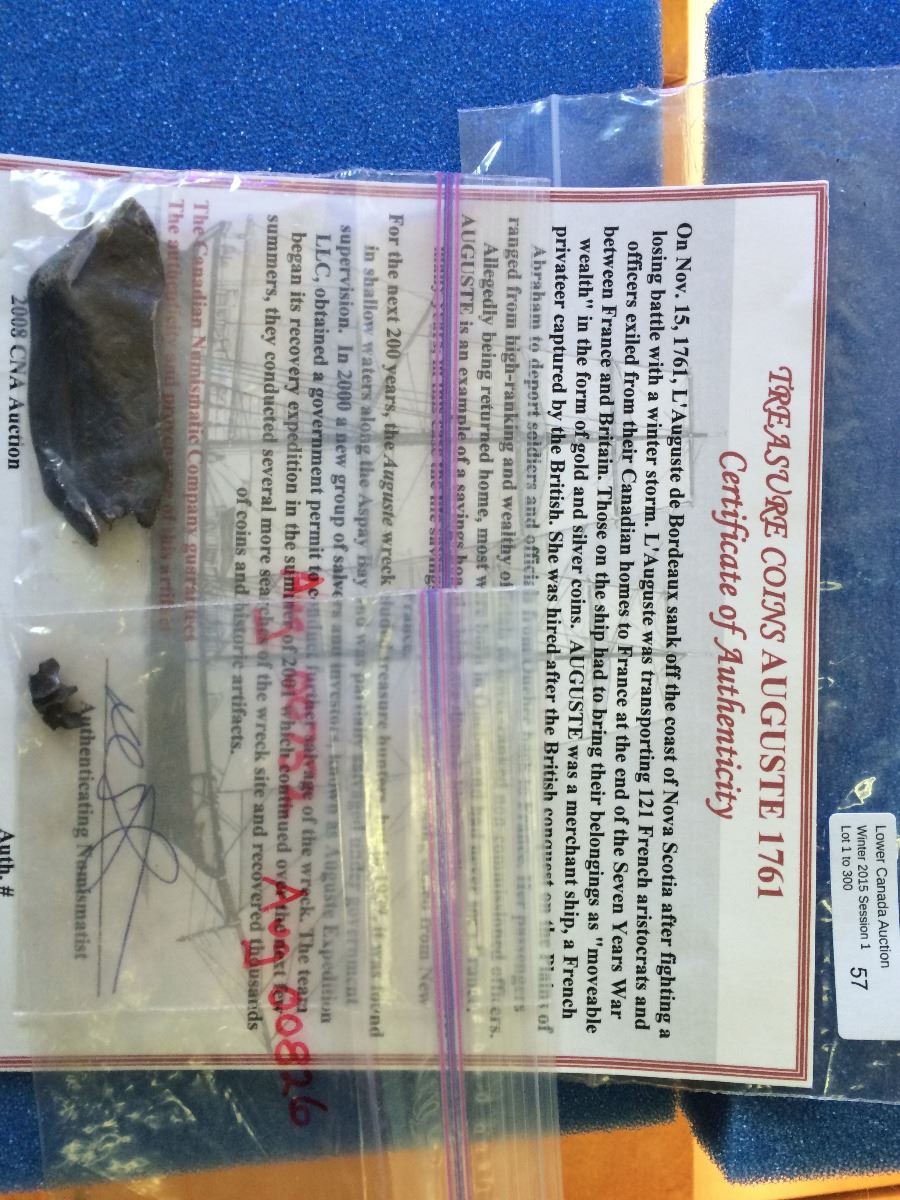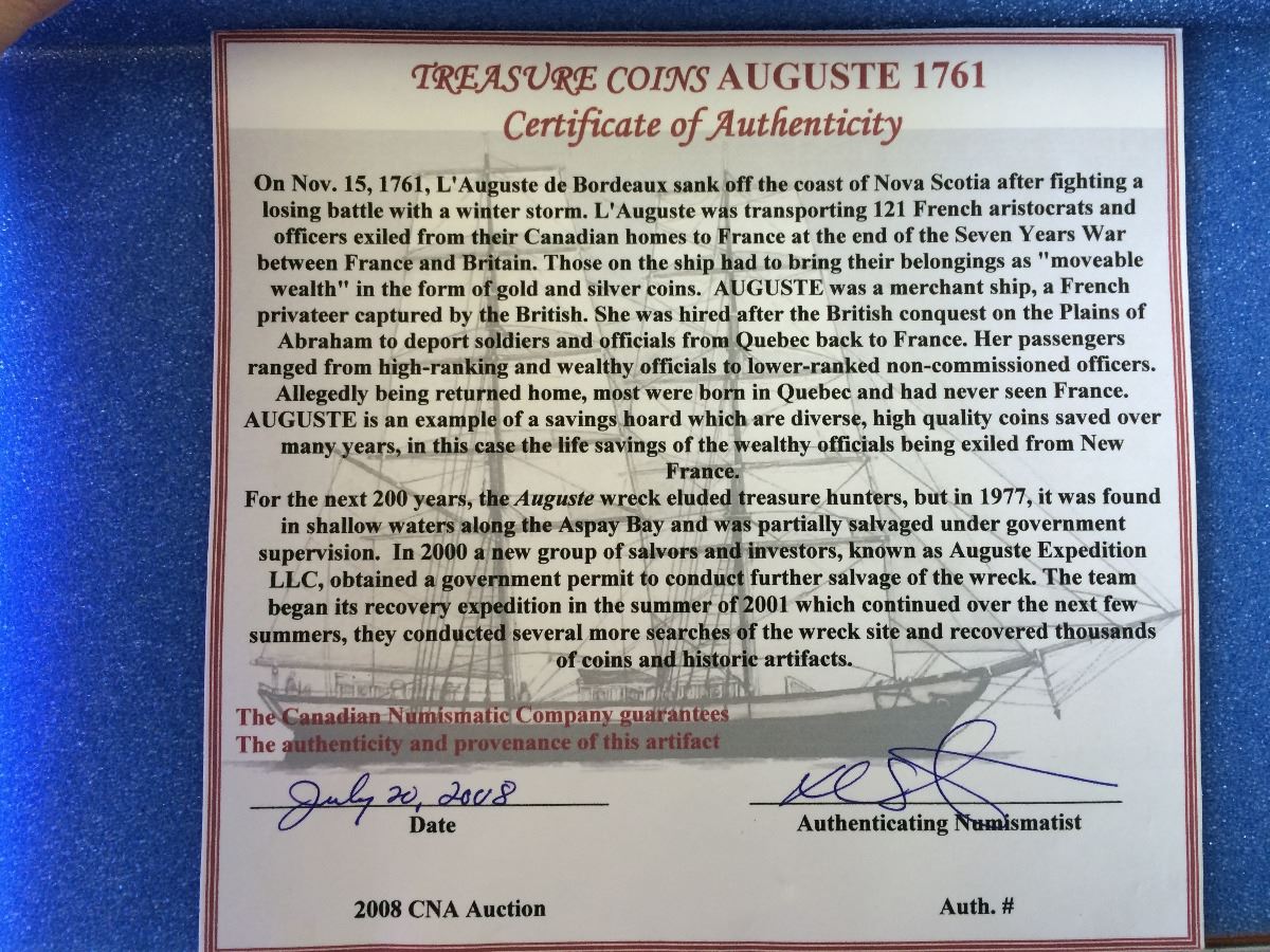 Treasure coins from the AUGUSTE 1761 with certificate of authenticity.
