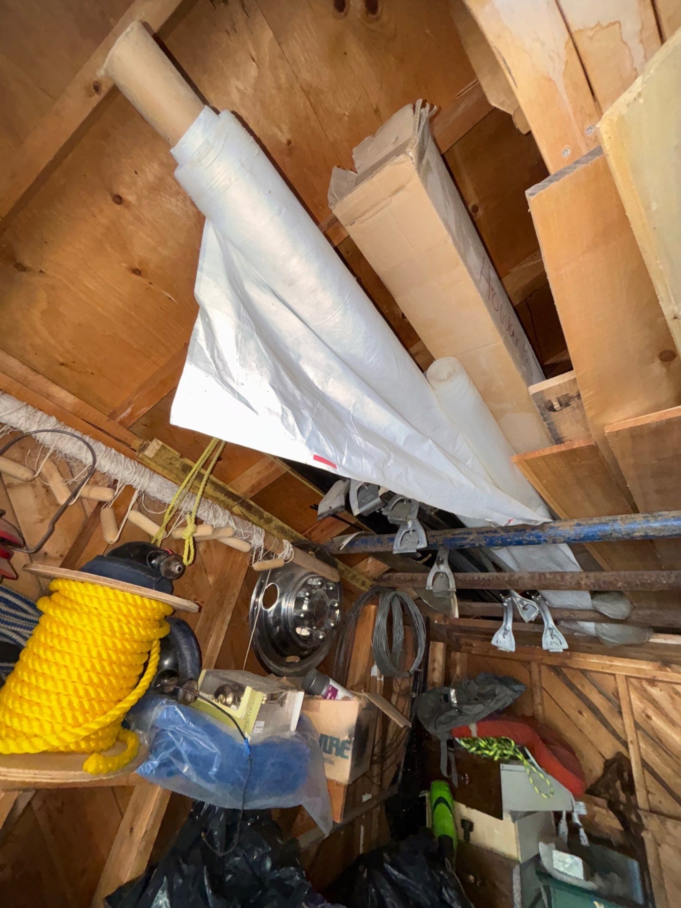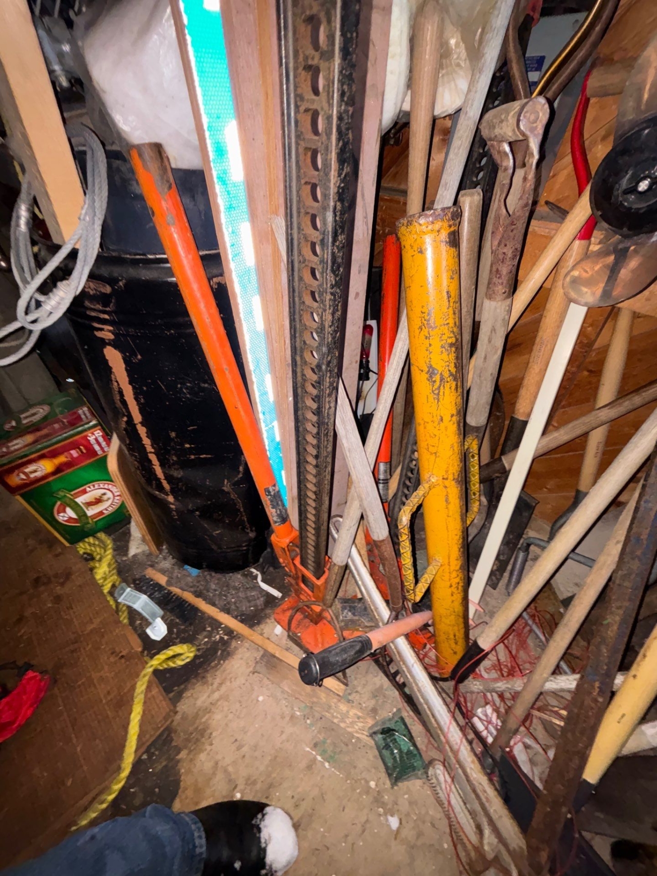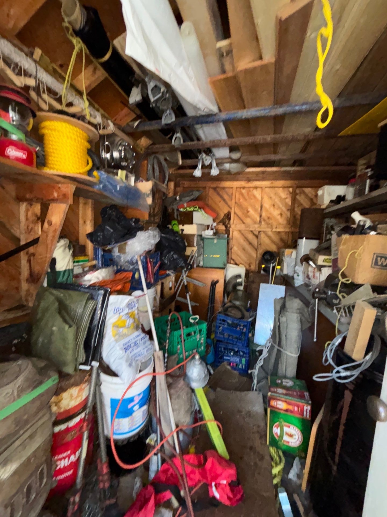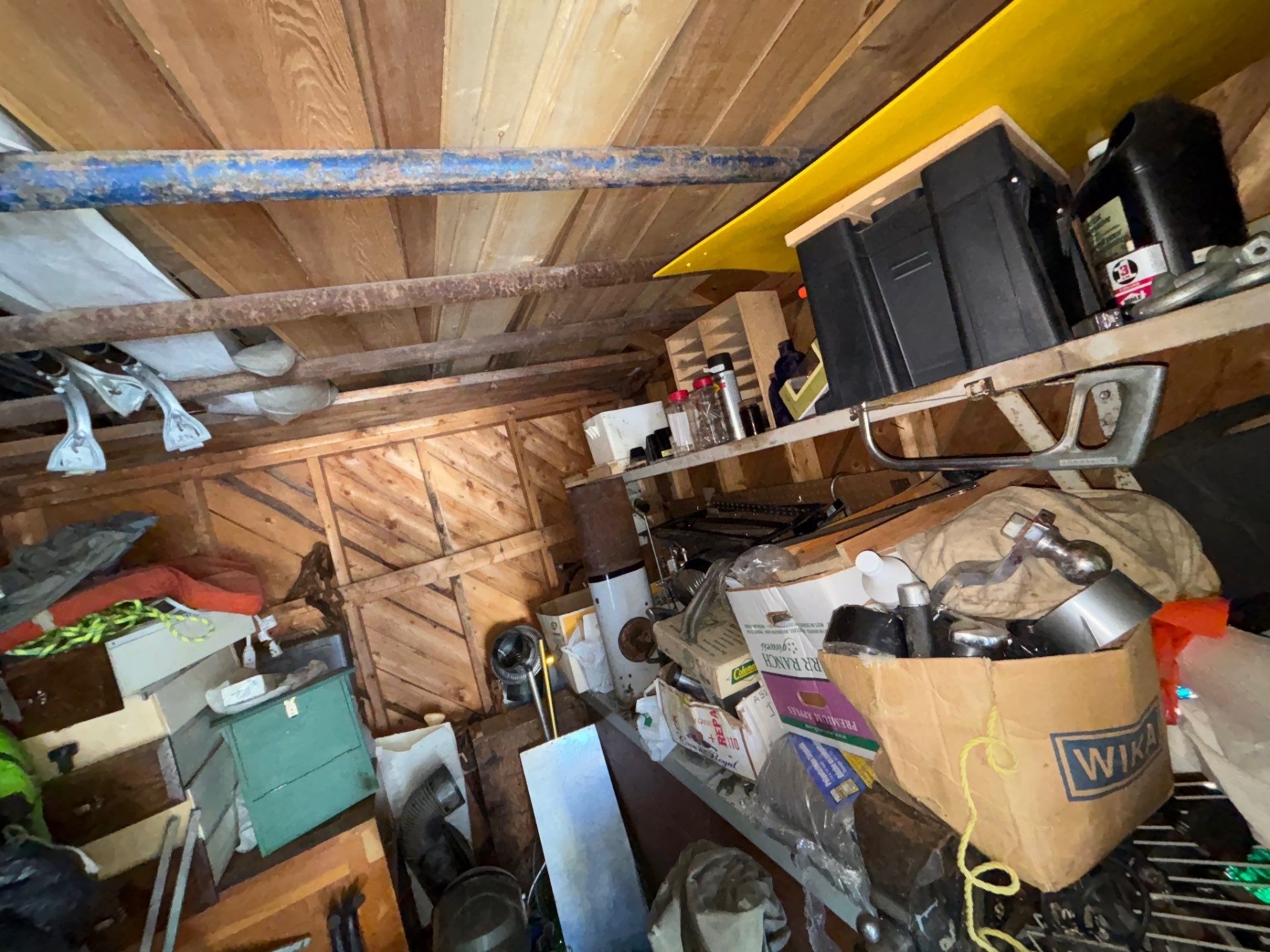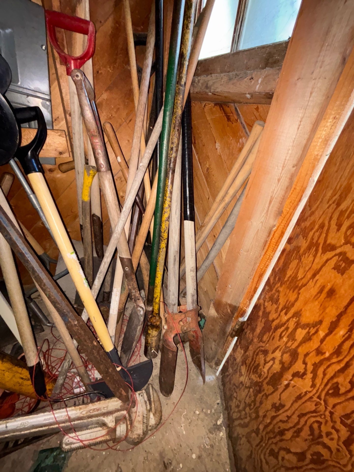 Treasure hunt all contents of shed, includes rigid large pipe wrench a number of vintage and antique yard tools, cast iron orange Jack storage containers, wood rope, tarps, and so much more not including cast-iron heaters, Coleman lanterns, and heater and workbench with vice