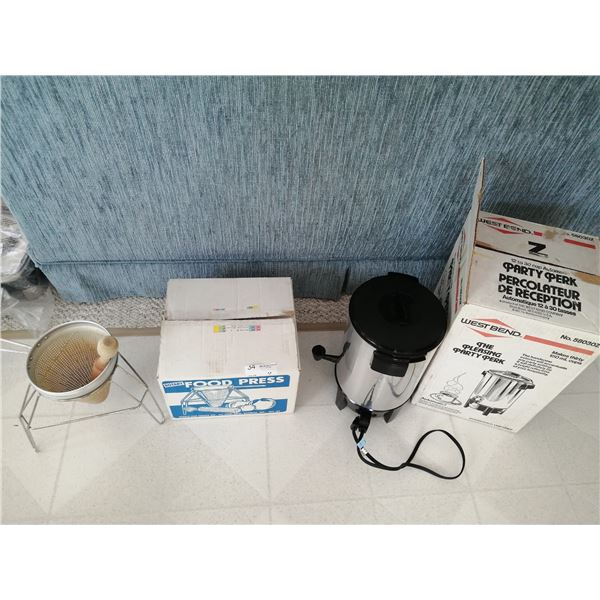 Vintage Food Press w/ Stand and West Bend 30-Cup Automatic Percolator (Model No. 58030Z)34 - Vintage Food Press w/ Stand and West Bend 30-Cup Automatic Percolator (Model No. 58030Z)