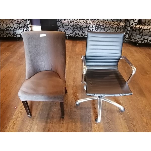 Upholstered High-Backed Decorative Dining Chair and Rolling Office Chair (Needs TLC)