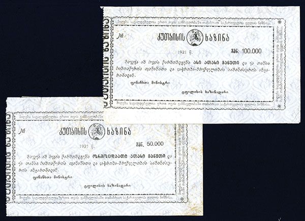Georgia, set of 2 local issue notes, includes 50000 and 10000, uniface and on watermarked paper, both choice VF with some mounting traces. Unsigned or dated, so they may be unissued remainder notes.