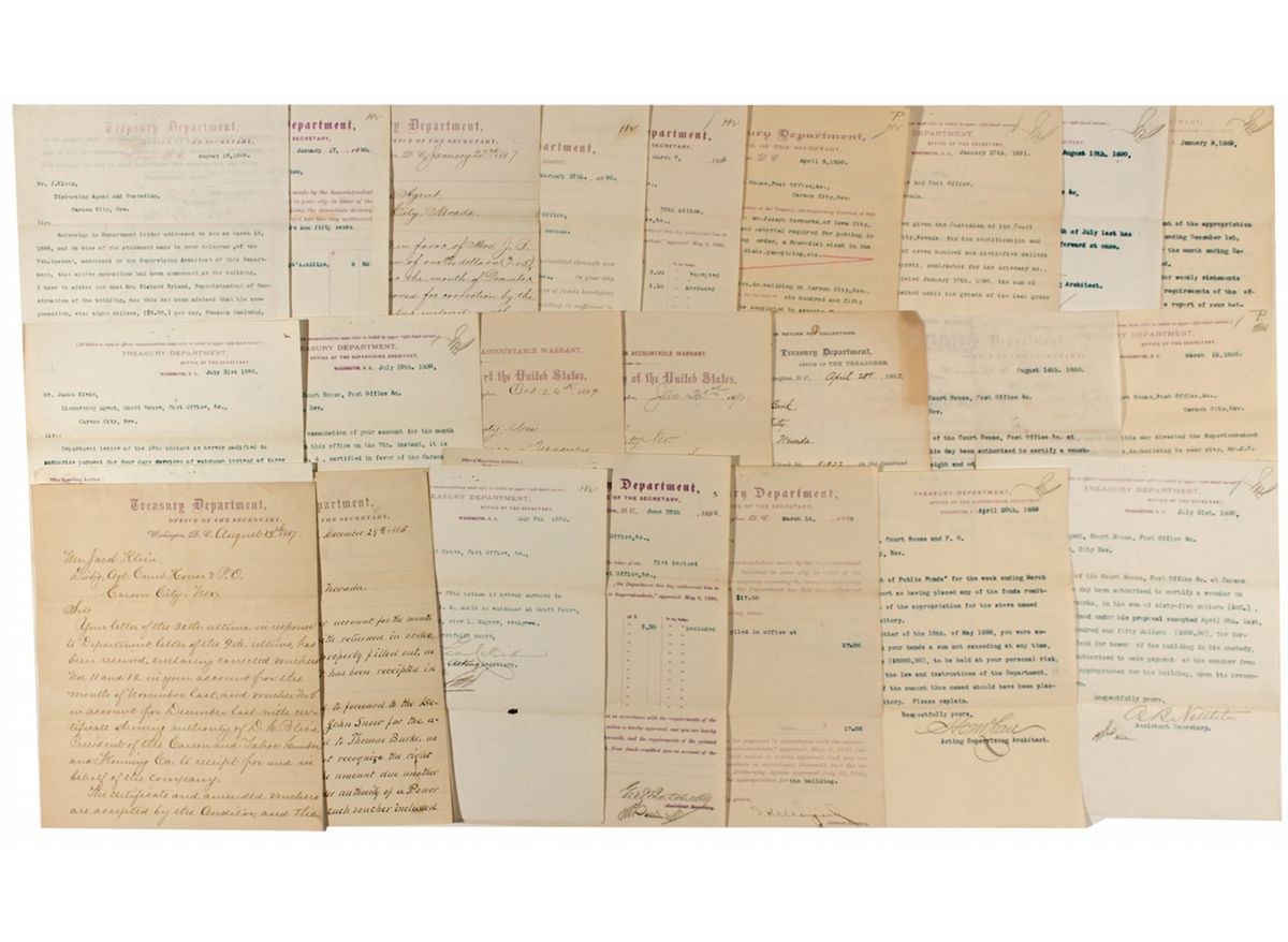 c1888 This is a collection of about 30 pieces of correspondence between the United States Treasury Department and Carson City Postal Disbursing Agent Mr. Jacob Stein. Some of the letters are handwritten, some are typed. They deal with the construction of the Carson City Courthouse and the expenses that the Federal Government is monitoring. All have fold creases, but are very legible and a nice grouping. - HKA#64158